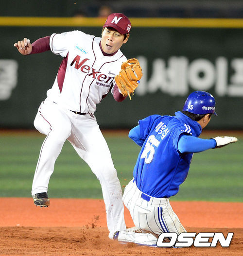 12일 오후 서울 목동구장에서 열린 '2013 한국야쿠르트 세븐 프로야구' 넥센 히어로즈와 삼성 라이온즈의 경기 3회초 무사 1루 조동찬의 타석, 1루주자 배영섭이 도루에 성공하고 있다.