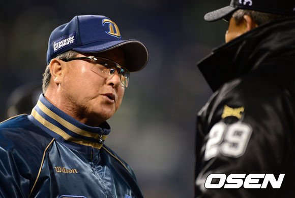 4회초 1사 1루 SK 박진만 타석에 NC 선발투수 아담이 보크 판정을 받자 김경문 감독이 심판 판정에 불만을 나타내고 있다.