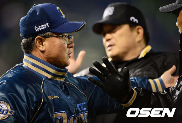 4회초 1사 1루 SK 박진만 타석에 NC 선발투수 아담이 보크 판정을 받자 김경문 감독이 심판 판정에 불만을 나타내고 있다.