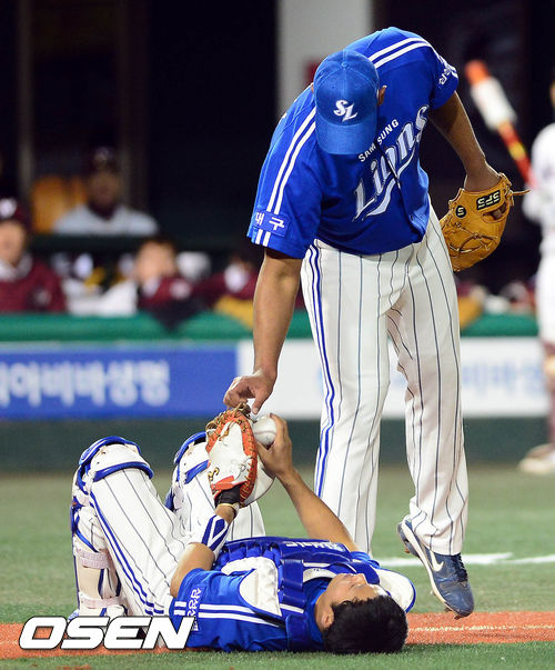 12일 오후 서울 목동구장에서 열린 '2013 한국야쿠르트 세븐 프로야구' 넥센 히어로즈와 삼성 라이온즈의 경기 4회말 1사 이성열의 뜬공을 잡은 이지영이 로드리게스에게 공을 건내고 있다.