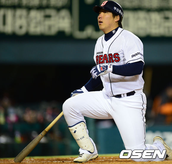 12일 오후 서울 잠실야구장에서 '2013 한국야쿠르트 세븐 프로야구' 두산 베어스와 롯데 자이언츠의 경기가 열렸다. 3회말 롯데 공격 2사 2, 3루 상황 4번 김현수가 롯데 선발 송승준의 공에 헛스윙 삼진 당한 뒤 아쉬워하고 있다.