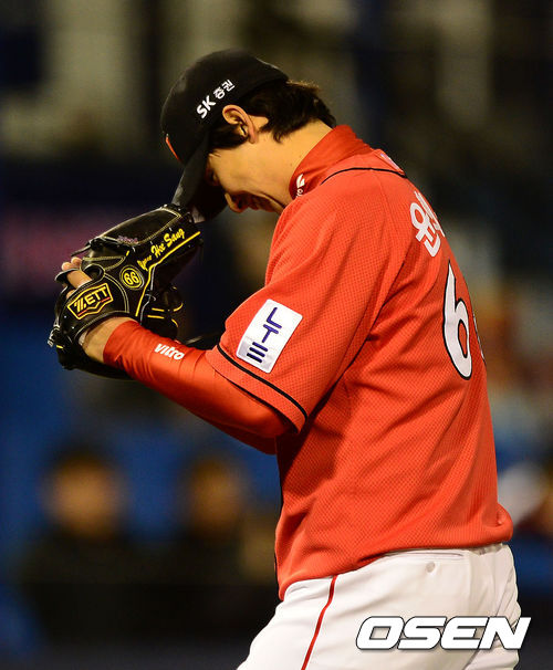 5회말 2사 1,3루에서 SK 선발 윤희상이 NC 김종호를 유격수 땅볼로 처리하고 박수를 치고 있다.