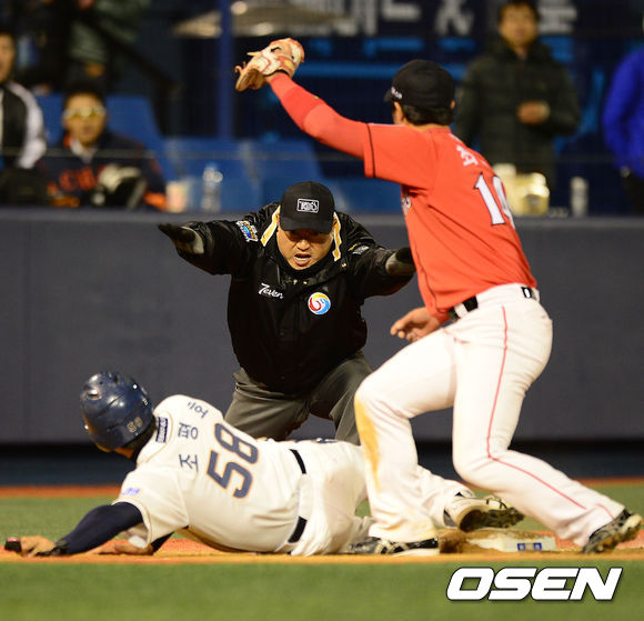 5회말 2사 2루에서 NC 조평호가 김태군의 우전안타에 3루를 지나 홈으로 향하다 귀루하며 SK 최정의 태그에 앞서 가까스로 세이프되고 있다.