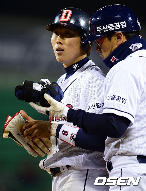12일 오후 서울 잠실야구장에서 '2013 한국야쿠르트 세븐 프로야구' 두산 베어스와 롯데 자이언츠의 경기가 열렸다. 4회말 두산 공격 2사 2루 상황 7번 허경민이 1타점 적시타를 날리고 김민호 1루 코치와 대화를 나누고 있다.