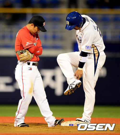 6회말 무사 1,3루에서 NC 이호준이 1타점 적시 2루타를 날리고 SK 정근우와 이야기를 나누고 있다.