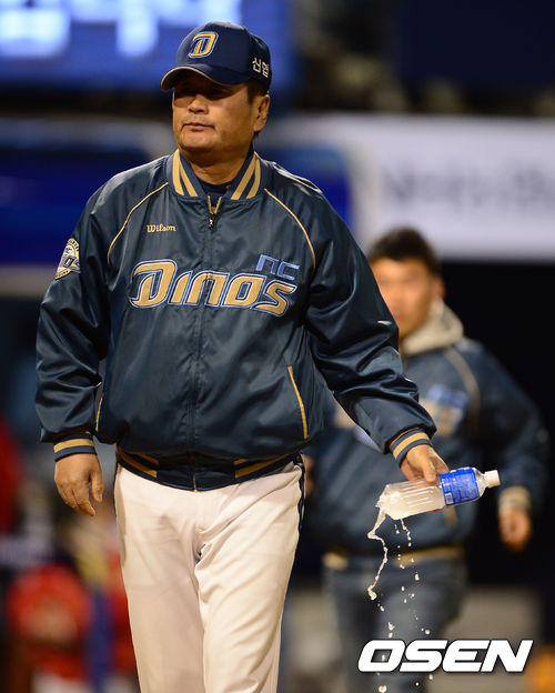 7회말 2사에서 NC 김종호가 부정 타격으로 아웃이 되자 한 팬이 음료수 페트병을 그라운드로 던졌다. 박승호 수석코치가 페트병을 줍고 있다.