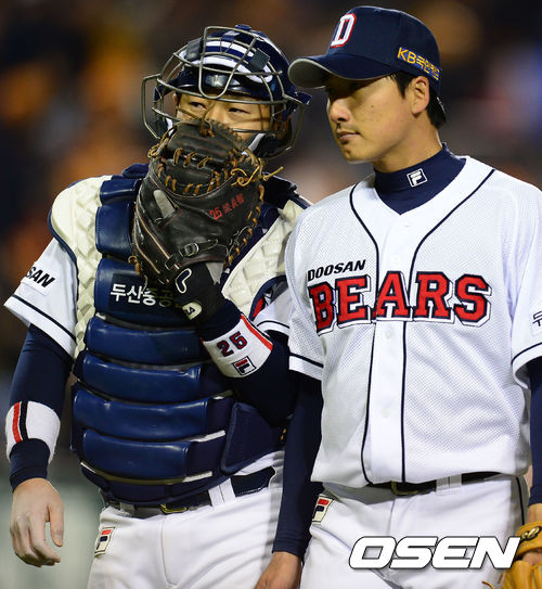 12일 오후 서울 잠실야구장에서 '2013 한국야쿠르트 세븐 프로야구' 두산 베어스와 롯데 자이언츠의 경기가 열렸다. 7회초 롯데 공격 2사 만루 상황 6번 황재균을 우익수 플라이로 처리하며 무실점으로 이닝을 마무리지은 두산 투수 정재훈과 포수 양의지가 더그아웃으로 들어오며 대화를 나누고 있다.