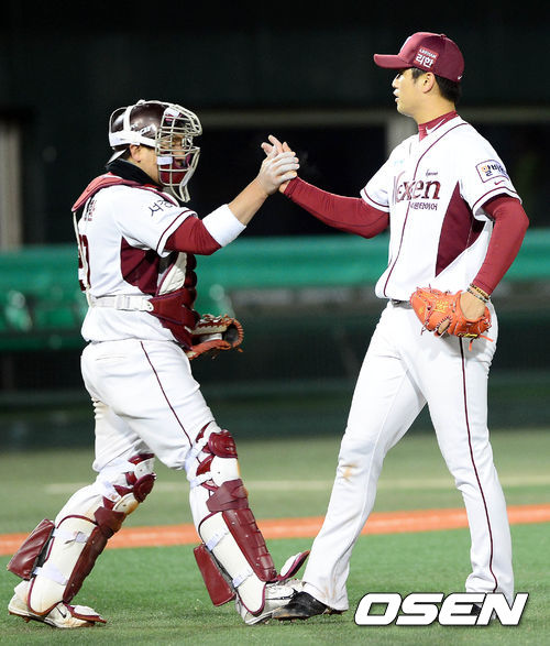 12일 오후 서울 목동구장에서 열린 '2013 한국야쿠르트 세븐 프로야구' 넥센 히어로즈와 삼성 라이온즈의 경기 종료 후 허도환과 손승락이 하이파이브를 하고 있다.