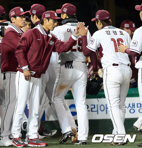 12일 오후 서울 목동구장에서 열린 '2013 한국야쿠르트 세븐 프로야구' 넥센 히어로즈와 삼성 라이온즈의 경기 종료 후 염경엽 감독과 강정호가 하이파이브를 하고 있다.