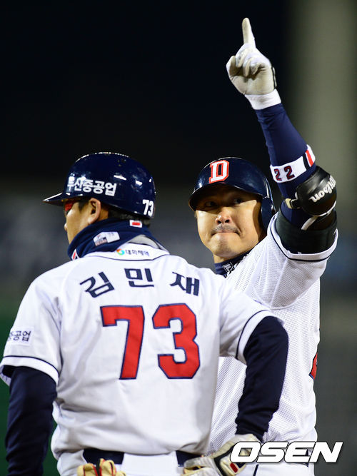12일 오후 서울 잠실야구장에서 '2013 한국야쿠르트 세븐 프로야구' 두산 베어스와 롯데 자이언츠의 경기가 열렸다. 8회말 두산 공격 무사 1, 2루 상황 5번 홍성흔이 추격의 1타점 적시타를 날리고 팬들에게 인사하고 있다.