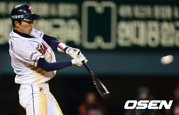 12일 오후 서울 잠실야구장에서 '2013 한국야쿠르트 세븐 프로야구' 두산 베어스와 롯데 자이언츠의 경기가 열렸다. 8회말 두산 공격 1사 2, 3루 상황 7번 허경민이 동점 적시타를 날리고 있다.