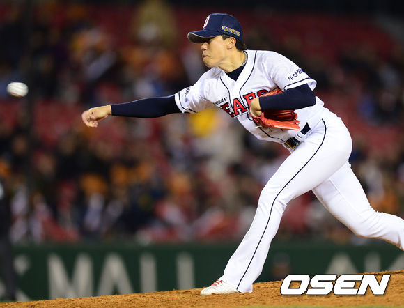 12일 오후 서울 잠실야구장에서 '2013 한국야쿠르트 세븐 프로야구' 두산 베어스와 롯데 자이언츠의 경기가 열렸다. 9회초 롯데 공격 구원 등판한 두산 투수 오현택이 힘차게 공을 던지고 있다.