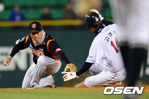 12일 오후 서울 잠실야구장에서 '2013 한국야쿠르트 세븐 프로야구' 두산 베어스와 롯데 자이언츠의 경기가 열렸다. 연장 11회말 두산 공격 1사 1루 상황 9번 손시헌의 중견수 플라이 때 주자 고영민이 2루 태그업에 성공하고 있다.