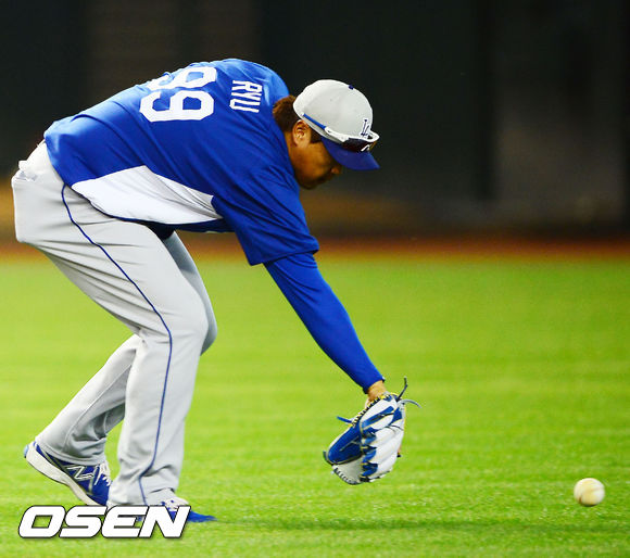 훈련 중 다저스 류현진이 볼을 잡으려 하고 있다.
