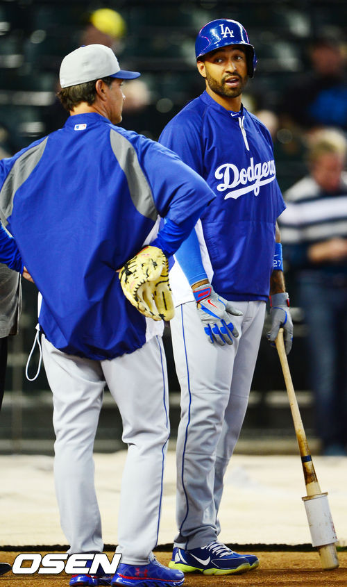 훈련 중 다저스 돈 매팅리 감독이 맷 켐프와 얘기를 나누고 있다.