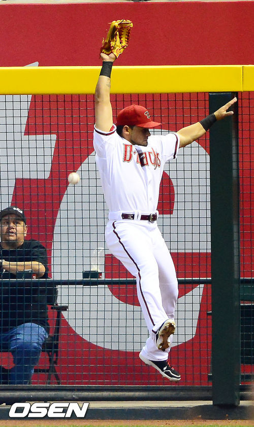 2회초 2사 다저스 A.J 엘리스의 타구를 애리조나 우익수 헤라르도 파라가 잡지 못하고 있다.