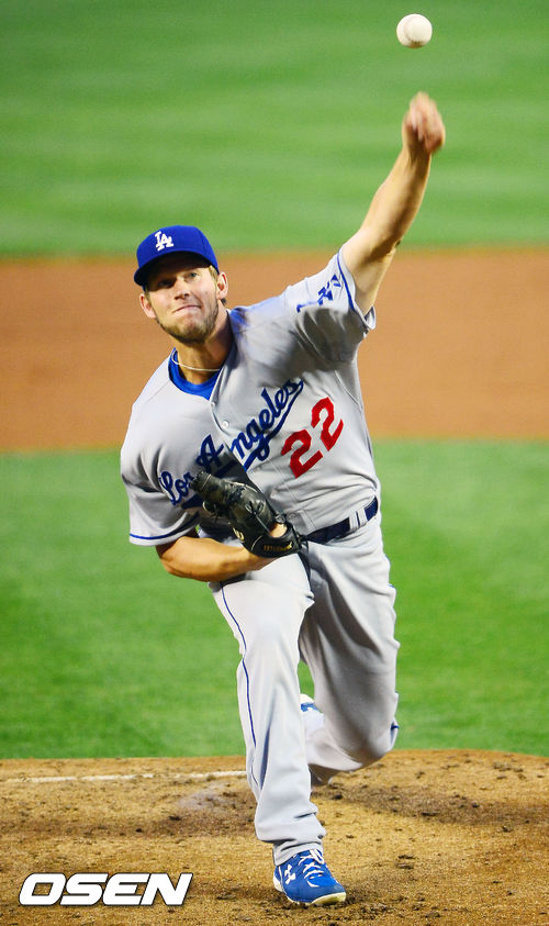 LA 다저스 선발 클레이튼 커쇼가 힘차게 공을 뿌리고 있다.