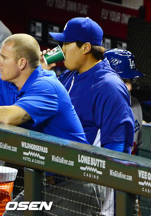 4회말 다저스 류현진이 덕아웃에서 경기를 지켜보며 물을 마시고 있다.