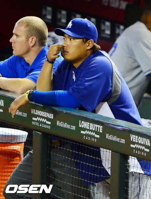 LA 다저스 류현진이 덕아웃에서 4회말 경기를 심각한 표정으로 지켜보고 있다.