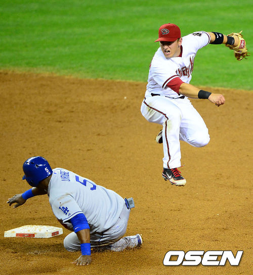 6회초 1사 주자 1루 LA 다저스 이디에의 2루수 병살타때 애리조나 유격수 클리프 페닝턴이 2루에서 다저스 우리베를 포스아웃 시킨 후 1루로 송구하고 있다.