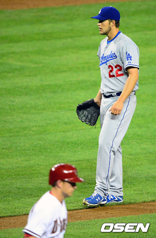 5회말 1사 주자 1루 LA 다저스 선발 클레이튼 커쇼가 애리조나 클리프 페닝턴을 볼넷으로 내보며 아쉬워하고 있다.