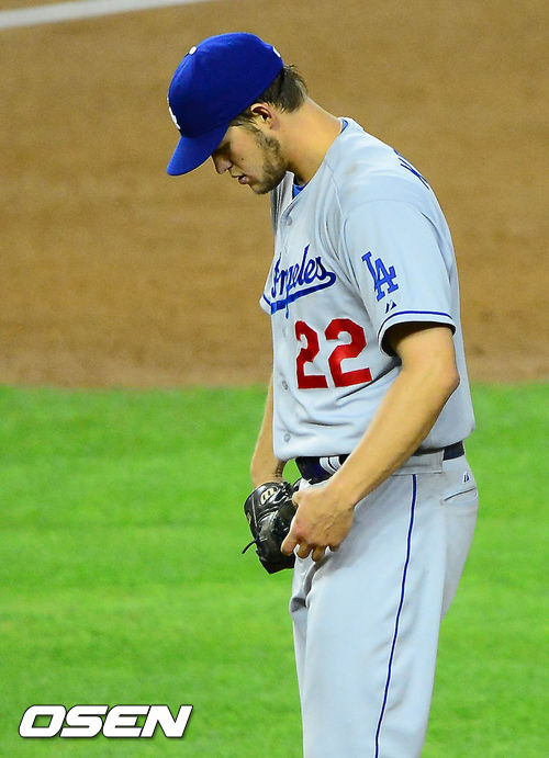 5회말 1사 주자 1루 LA 다저스 선발 클레이튼 커쇼가 애리조나 클리프 페닝턴을 볼넷으로 내보며 아쉬워하고 있다.