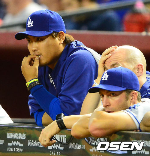 9회초 LA 다저스 류현진이 덕아웃으로 나와 손톱을 물어뜯으며 초조하게 경기를 지켜보고 있다. / rumi@osen.co.kr