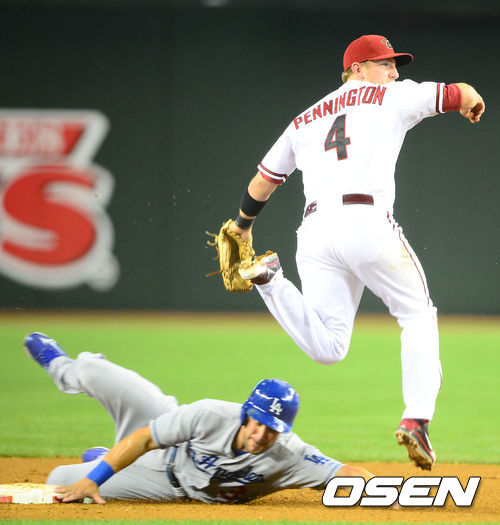 9회초 1사 주자 1,2루 LA 다저스 헤어스톤의 2루수 병살타때 2루에서 애리조나 유격수 클리프 페닝턴이 LA 다저스 슈마커를 포스아웃 시킨 후 1루로 송구하고 있다. / rumi@osen.co.kr