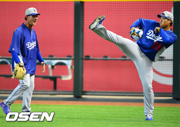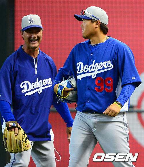 13일 오전(이하 한국시간) 미국 애리조나주 피닉스 체이스필드에서 애리조나 다이아몬드백스와 LA 다저스의 경기 전 양 팀 훈련시간에서 LA 다저스 돈 매팅리 감독이 훈련 중인 류현진에게 쿵푸자세를 취하며 도발(?)을 하자 류현진이 돈 매팅리 감독에게 태권도 발차기 자세를 보여주며 그를 놀라게 했다. / rumi@osen.co.kr