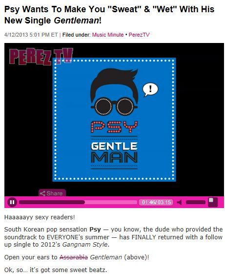 미국의 유명 블로거이자 방송인인 페레즈 힐튼이 "싸이가 '젠틀맨'으로 당신을 땀흘리게 만들고 싶어한다"라며 자신의 블로그에 가수 싸이의 신곡 '젠틀맨'을 소개했다.