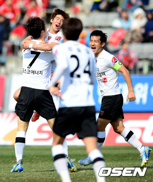 후반 포항 배천석이 동료골을 넣고 동료선수들과 기뻐하고 있다./jpnews@osen.co.kr