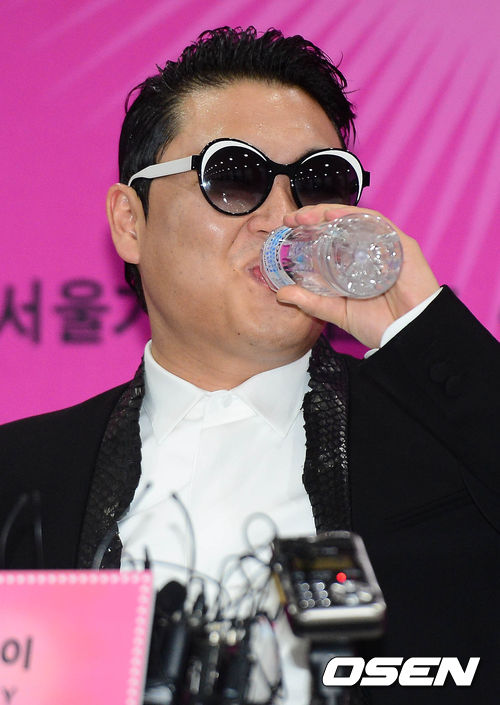 싸이가 13일 오후 서울월드컵경기장에서 열리는 단독 콘서트 '해프닝'에 앞서 열린 기자회견에서 음료를 마시고 있다.