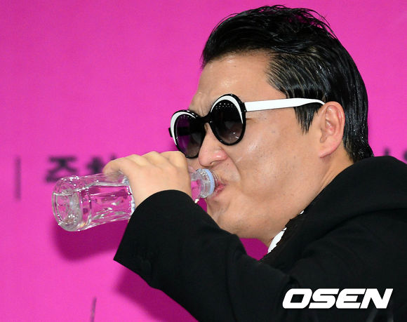 싸이가 13일 오후 서울월드컵경기장에서 열리는 단독 콘서트 '해프닝'에 앞서 열린 기자회견에서 음료를 마시고 있다.