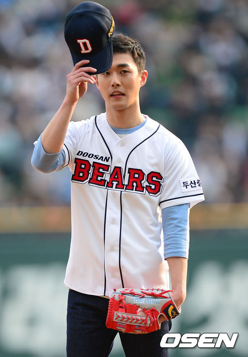 13일 오후 서울 잠실야구장에서 '2013 한국야쿠르트 세븐 프로야구' 두산 베어스와 롯데 자이언츠의 경기가 열렸다. 드라마 '푸른거탑'의 배우 김민찬이 시구자로 나서 인사하고 있다.