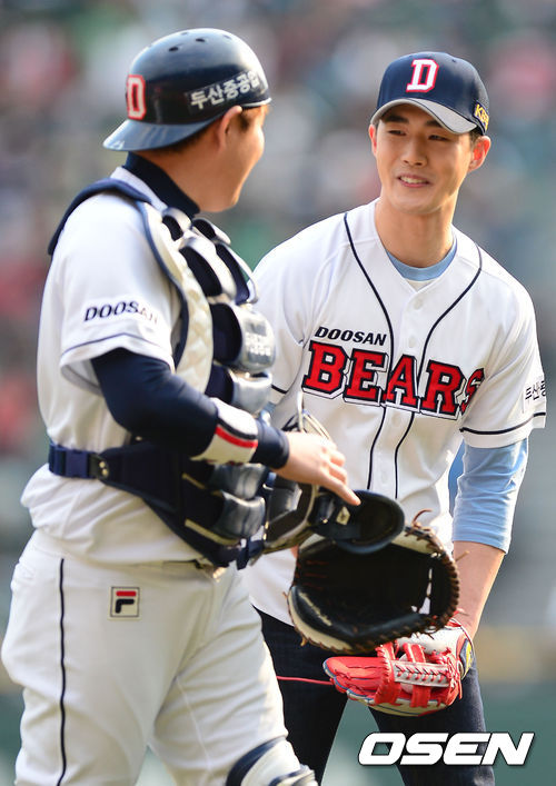 13일 오후 서울 잠실야구장에서 '2013 한국야쿠르트 세븐 프로야구' 두산 베어스와 롯데 자이언츠의 경기가 열렸다. 드라마 '푸른거탑'의 배우 김민찬이 시구자로 나서 두산 포수 양의지와 인사를 나누고 있다.