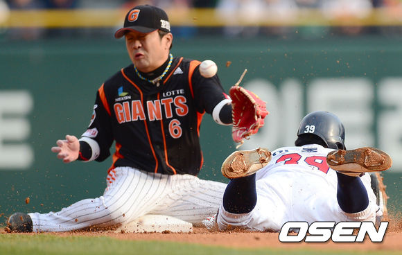 13일 오후 서울 잠실야구장에서 '2013 한국야쿠르트 세븐 프로야구' 두산 베어스와 롯데 자이언츠의 경기가 열렸다. 1회말 두산 공격 1사 1루 상황 주자 이종욱이 2루 도루에 성공하고 있다.