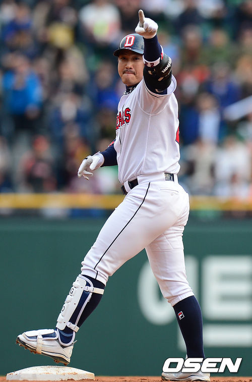 13일 오후 서울 잠실야구장에서 '2013 한국야쿠르트 세븐 프로야구' 두산 베어스와 롯데 자이언츠의 경기가 열렸다. 1회말 두산 공격 2사 1, 2루 상황 두산 홍성흔이 선제 1타점 적시타를 날리고 기뻐하고 있다.
