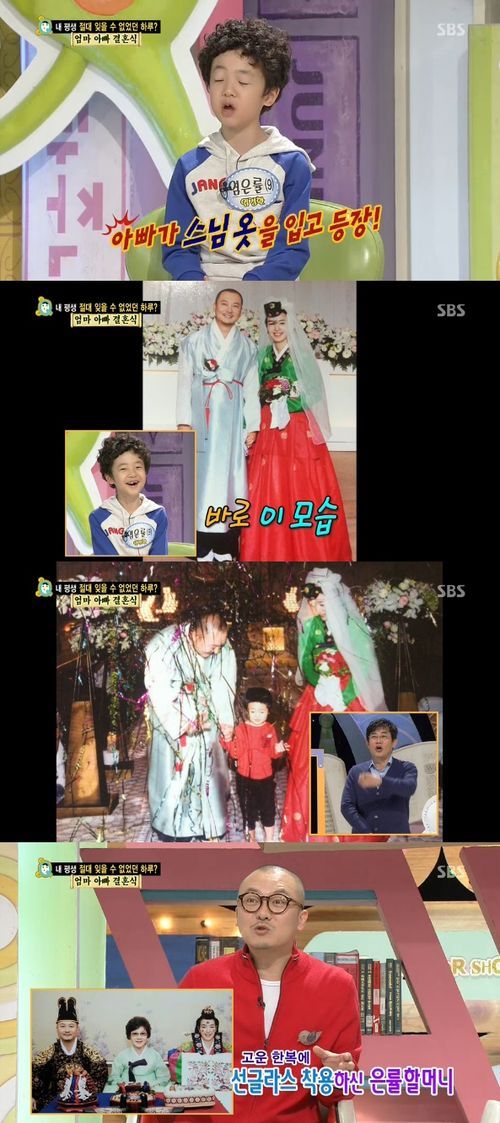 이에 염경환은 "특별한 결혼식을 하고 싶어서 한복을 맞춰 입었는데 회색 두루마기가 스님 옷 같았다. 그리고 하객분들 중에 친한 스님이 와서 얘기를 하니까 은률이는 아빠가 스님인 줄 알고 대성통곡했다"며 결혼식 사진을 공개했다.