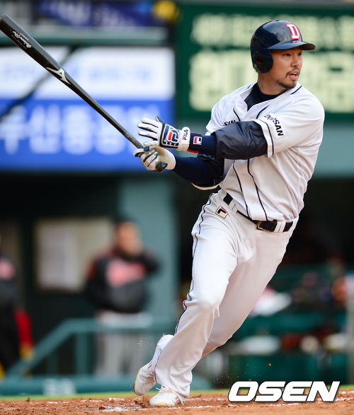 13일 오후 서울 잠실야구장에서 '2013 한국야쿠르트 세븐 프로야구' 두산 베어스와 롯데 자이언츠의 경기가 열렸다. 1회말 두산 공격 2사 2, 3루 상황 6번 오재원이 1루선상으로 향하는 타구를 날리고 있다.