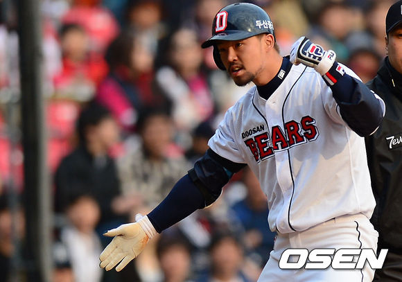 13일 오후 서울 잠실야구장에서 '2013 한국야쿠르트 세븐 프로야구' 두산 베어스와 롯데 자이언츠의 경기가 열렸다. 1회말 두산 공격 2사 2, 3루 상황 6번 오재원이 1루선상으로 향하는 타구를 날리고 상대 실책에 의해 3루까지 진루한 뒤 환호하고 있다.