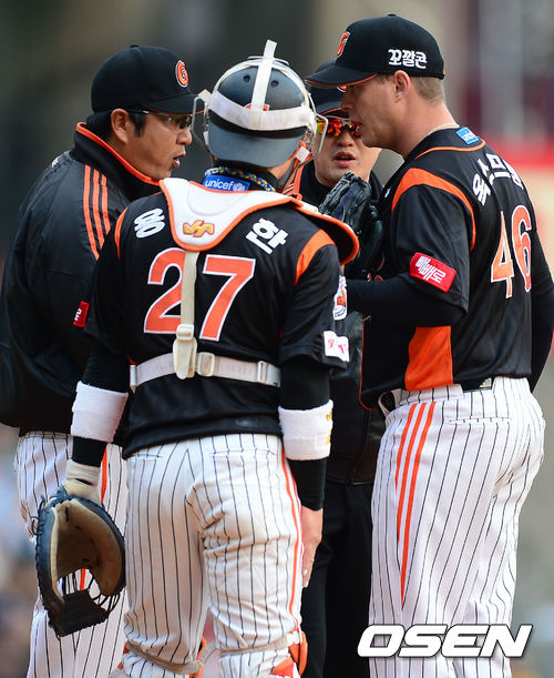 13일 오후 서울 잠실야구장에서 '2013 한국야쿠르트 세븐 프로야구' 두산 베어스와 롯데 자이언츠의 경기가 열렸다. 1회초 4실점한 롯데 선발 옥스프링과 정민태 코치가 마운드에서 대화를 나누고 있다.