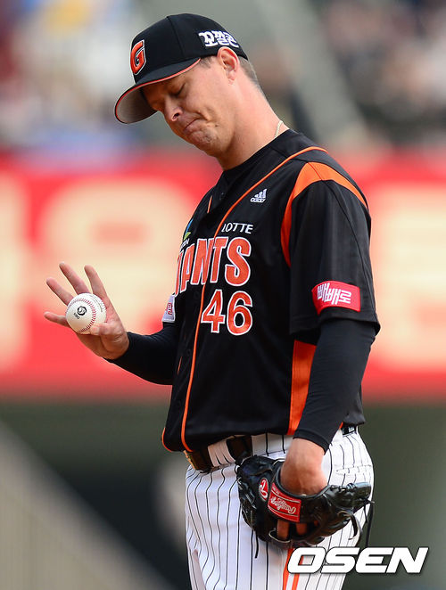 13일 오후 서울 잠실야구장에서 '2013 한국야쿠르트 세븐 프로야구' 두산 베어스와 롯데 자이언츠의 경기가 열렸다. 1회말 4실점한 롯데 옥스프링이 아쉬운 표정으로 포수에게 사인을 보내고 있다.