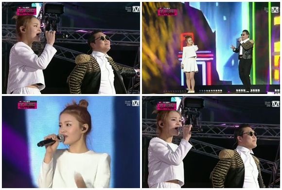 이날 공연의 드레스코드인 흰 색 옷을 입고 무대에 선 그는 이 곡의 박정현 파트를 부르며 싸이와 호흡을 맞췄다.