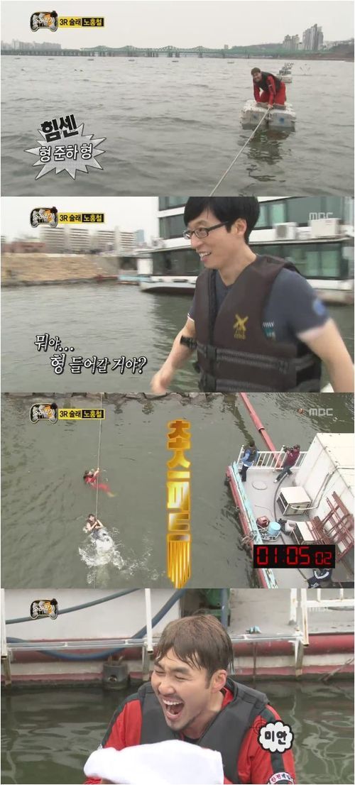 유재석 역시 “역시 돌+아이다”라고 노홍철의 독한 모습에 입을 다물지 못했다. 노홍철은 30분이라는 시간 동안 한강에서 몸을 피했지만 멤버들은 가만히 놔두지 않았다. 하하 역시 물에 뛰어들었다. 하지만 추운 한강물에 금세 뭍으로 나왔다.
