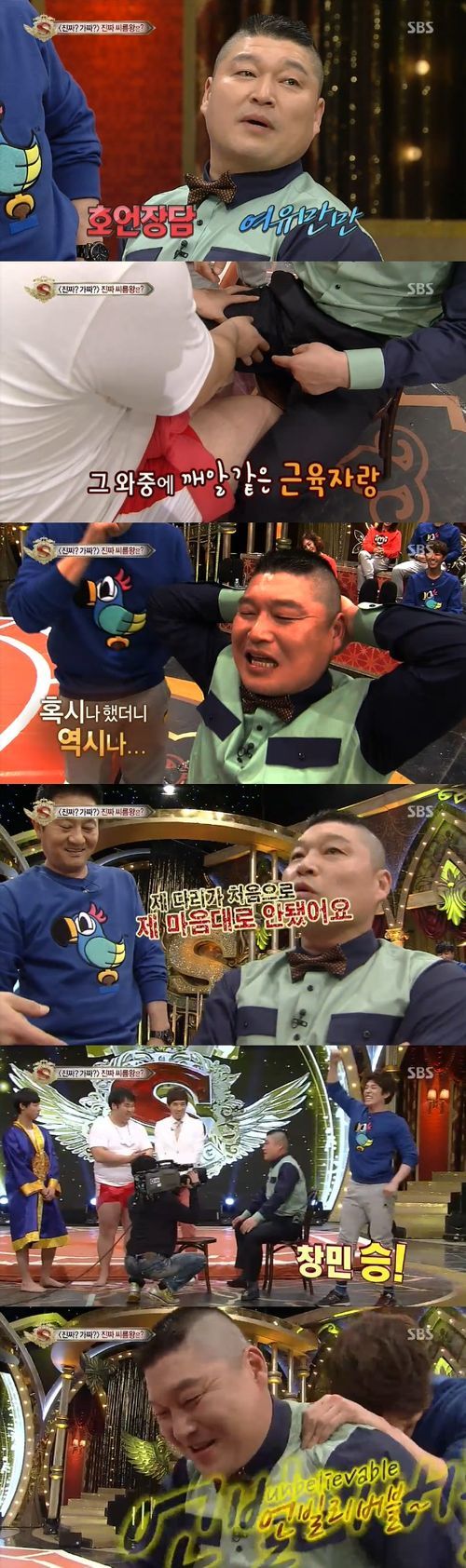 이어 또 다시 허벅지씨름에 도전하며 "내가 안쪽 근육이 좋다"고 근육자랑을 했다. 하지만 0.5초도 안되는 시간에 대결이 끝났다. 이뿐 아니라 이창민과의 대결에서도 완벽하게 지는 굴욕을 당했다.
