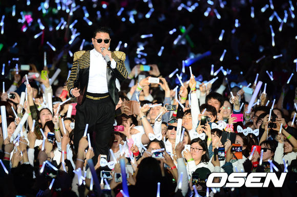 싸이가 13일 오후 서울월드컵경기장에서 열린 단독 콘서트 '해프닝'에서 공연을 펼치고 있다.