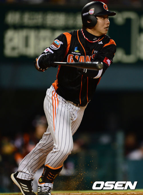 13일 오후 서울 잠실야구장에서 '2013 한국야쿠르트 세븐 프로야구' 두산 베어스와 롯데 자이언츠의 경기가 열렸다.7회초 롯데 공격 2사 1, 2루 상황 4번 김대우가 추격의 1타점 적시타를 날리고 있다.