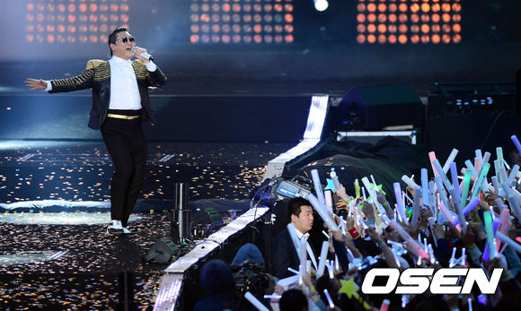 싸이가 13일 오후 서울월드컵경기장에서 열린 단독 콘서트 '해프닝'에서 공연을 펼치고 있다.