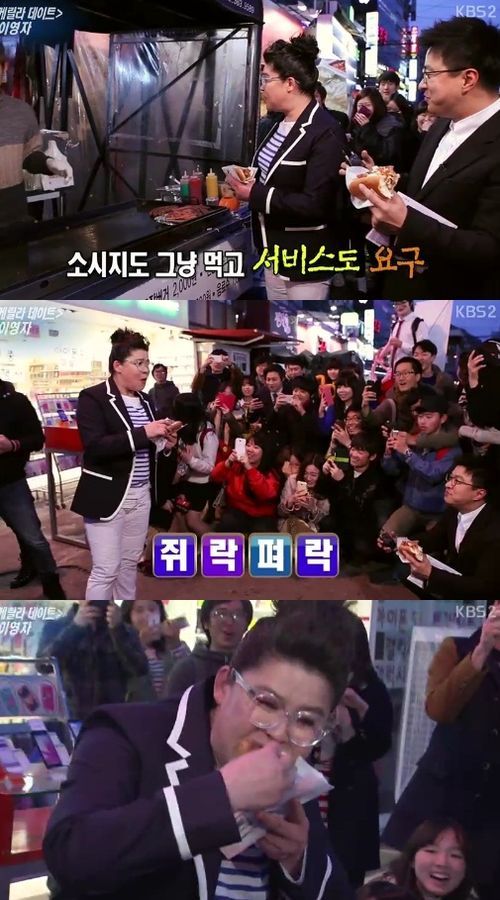 이날 이영자는 홍대 거리 데이트를 하며 핫도그 가게에 들러 맨 손으로 소시지를 덥석 집어 들었고 몰려든 팬들을 자리에 앉힌 후 본격적인 먹방을 보여줘 환호를 이끌어냈다.