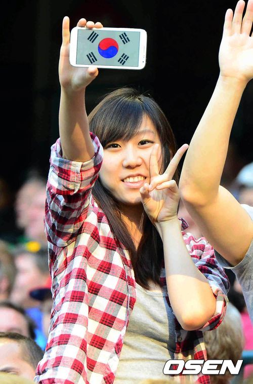 14일 오전(이하 한국시간) 미국 애리조나주 피닉스 체이스필드에서 벌어진 애리조나 다이아몬드백스와 LA 다저스의 경기 한국 교민이 스마트폰에 태극기를 띄워놓고 응원을 하고 있다.